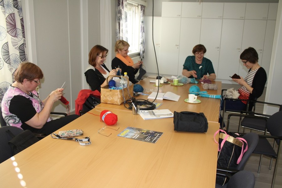 On taas tiistai-ilta ja 26.4.2016. Taas iloinen joukko naisia kokoontuu Kylätalo Mietolaan. Illan aikana kuuluu iloisen puheensorinan väliin huuhdaduksia: iik, ei,ei ja silmuikoita putoilee puikoilta ja niitä nostetaan. Vähän joutuu purkamaankin tehtyä työtä ja lopulta kantapäitä ilmestyy jokaiseen melkein jokaiseen sukkaan. Iloisessa tunnelmassa tutustumme toisiimme ja juomme taas kahvia tai teetä. Kotiläksyä saamme tehtäväksi sukkaa niin pitkälle että olemme kärkikavennuksen kohdalla seuraavalla eli viimeisellä kerralla.